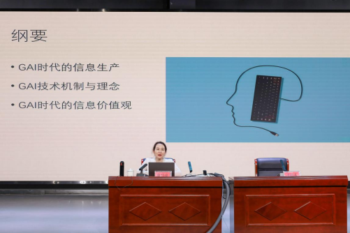 陈昌凤教授以国内外生成式人工智能应用与发展为切入点,结合数字虚拟主播、机器人记者等案例,从GAI(生成式人工智能)时代的信息生产、GAI技术机制与理念以及GAI时代的信息价值观三方面进行阐述,引领学生思辨GAI时代人类文明及信息价值取向。