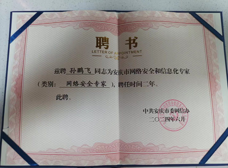 为发挥专家智库作用,提高网信工作决策的科学性,中共安庆市委网信办组织遴选并研究确定了2024年度安庆市网络安全和信息化专家。我院教师孙鹏飞受聘担任网络安全专家。