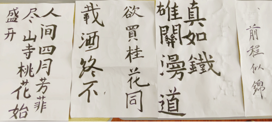 活动中支部党员书写出自己喜爱的红色诗句,“雄关漫道真如铁,而今迈步从头越”、“待到山花烂漫时,她在丛中笑”......学生们一笔一画,屏气凝神专注地描摹书法。提笔、落笔,横、竖、撇、捺在纸上跳跃,墨色沾染纸张,勾勒出笔直有力的汉字。一张张空白的纸张在学生的笔下穿上“新衣”,传达出浓浓的中华精神。