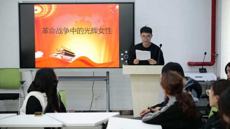 “不知道大家有没有看过这张照片,在生命的最后时刻,日军将她押赴刑场。成本华整理了自己的头发,理了理破旧的衣衫,脸上带着从容与蔑视,双手交叉抱在胸前,镇定地面对死亡。”研究生支部2024级殷雪从一张照片引入,介绍了来自安徽和县的成本华。年仅24岁的成本华带着对祖国的热爱以及对胜利的坚定信念英勇就义。殷雪表示像成本华这样为国奉献的女性还有很多,她说:“我们要铭记这些光辉女性的事迹,传承她们的精神,以实际行动践行党员使命。”