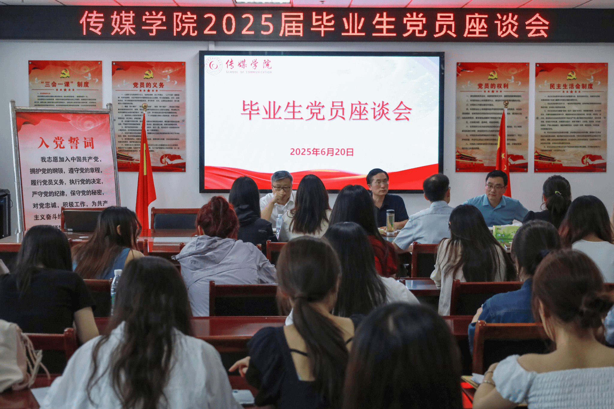 座谈会上,詹德全围绕毕业生党员的责任担当与职业发展提出殷切期望。他强调,毕业生党员要始终牢记党员第一身份,将“平常时候看得出来、关键时刻站得出来、危难关头豁得出来”的担当精神融入职业实践;要从细微处践行责任,既要以严谨态度做好每一件事,把使命扛在肩上做“实干家”,更要在专业领域深耕细作,以过硬本领夯实职业根基;要以提升学历为突破口,主动攀登更高发展平台,将个人成长融入国家发展大局,在传媒行业及更广阔领域中书写新时代青年的担当答卷。