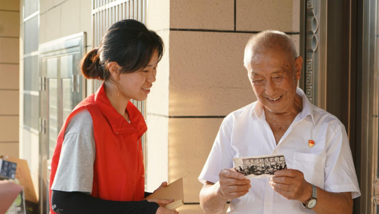 图为实践团成员为抗美援朝铁道兵吴映泉展示学校学生的手写祝福明信片。