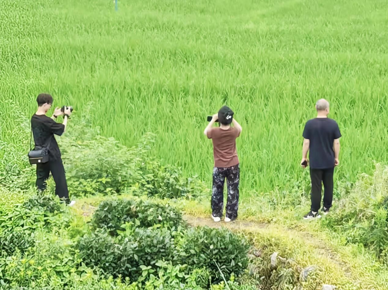 实践团在村干部的带领下来到了“桐塘香”有机水稻种植基地,实地了解有机水稻种植情况。村主任为成员们细心介绍着当地有机水稻的相关信息,实践团成员们积极地与村主任交谈学习,认真记录实践内容。通过介绍了解到,这片稻田已种植有机水稻100亩,由桐塘香水稻合作社姚承高承包。实践团的两个成员决定和村主任一同下地近距离参观水稻,拍摄水稻的长势情况。