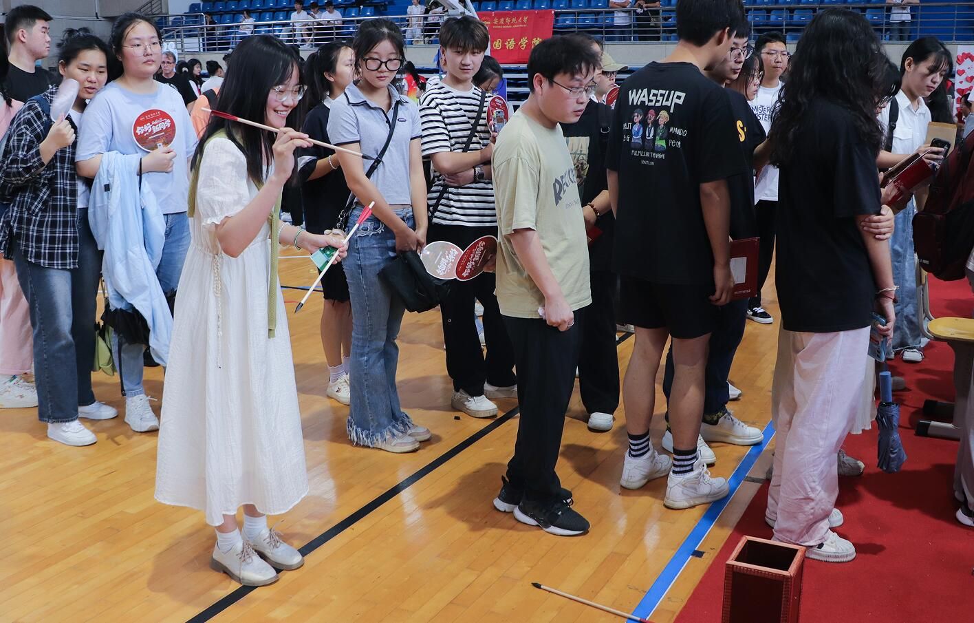 新闻传播学类专业2023(6)班的程俨完成报到后,尝试了投壶游戏。“第一天来学校,还有些拘束,但是玩了这个游戏后,我的心情得到放松。”他表示,游戏结果并不是最重要的东西,玩游戏重在体验。游戏过程中,新生们不断调整自己与投壶的距离和投射的方向,一次又一次投掷着。