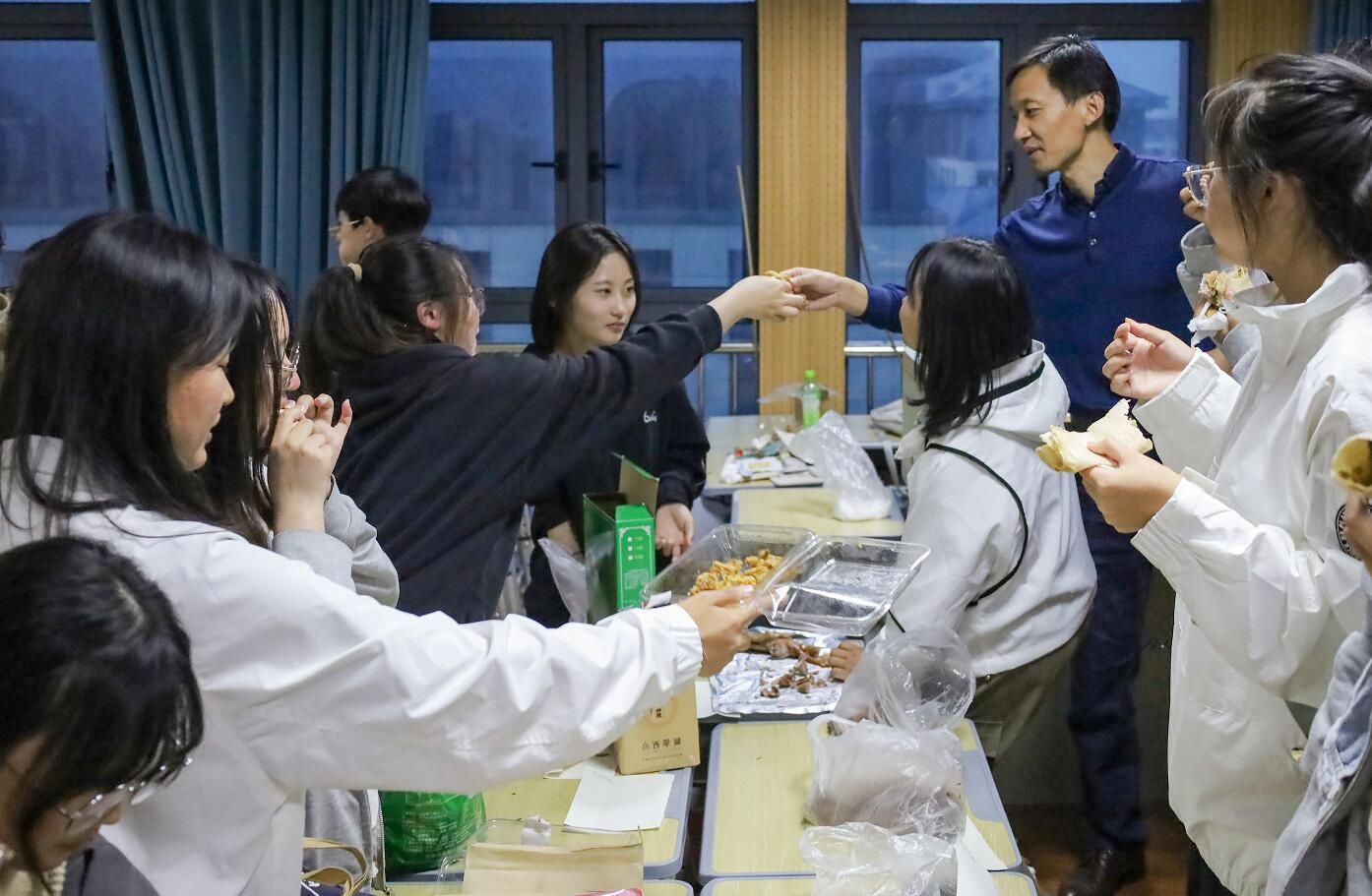 质地细腻的采石矶茶干就着酸豆角、蒸槐花,外裹一张煎饼,其独特的口感引得同学们纷纷加入品尝“大军”。据活动负责人、新闻传播学类专业2023(8)班的朱研溪介绍,本次分享会的美食共有20余种,类型丰富,包涵休闲零食、各类饼干、糕点、肉质食品、茶饮冲泡制品等。“希望学生能通过分享家乡特产,增进彼此的感情,更快融入新环境。”她表示。