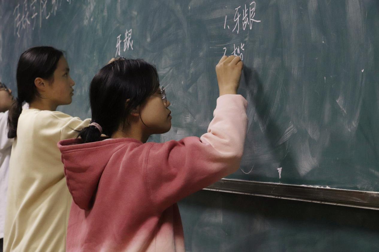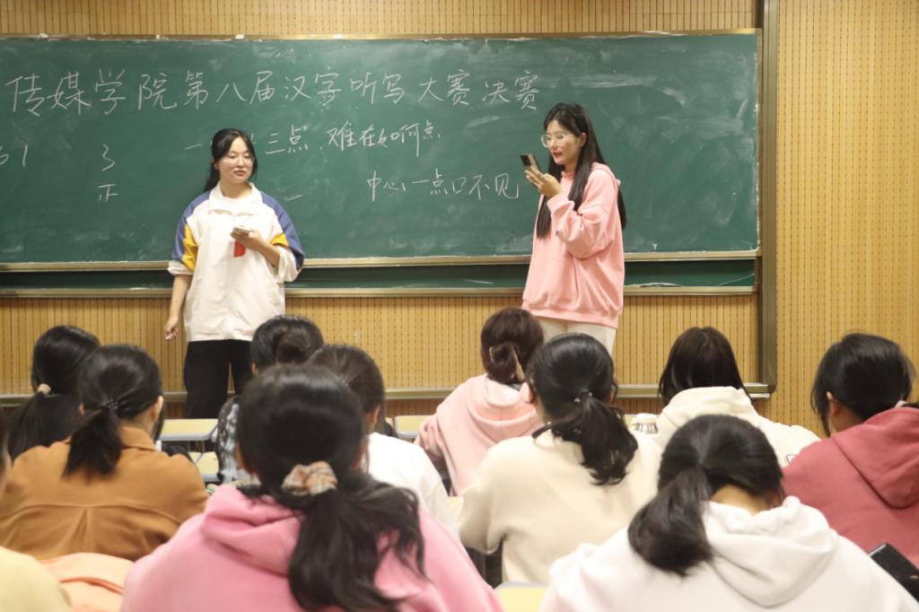 初赛采取考试的形式,在规定时间内完成答卷,由评委进行批改打分,取总分排名前四的小组进入决赛。各队选手查漏补缺,复习生僻字,通过小组成员互相提问的方式熟记生词。“我认识了许多生僻字,也发现有些字我一直以来都写错了。”新闻传播学类专业2022(1)班郭墨香说到。