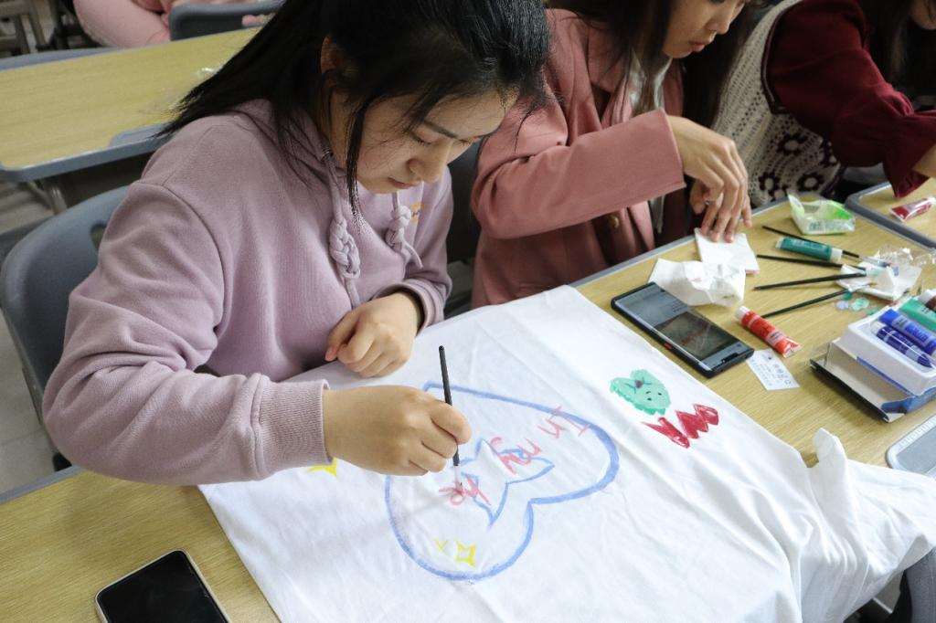 “DIY纯白文化衫有趣又有创意。”新闻传播学类专业2021(5)班梁淑琴在纯白文化衫上绘制了动漫《咱们裸熊》中的熊猫形象,她表示在绘制完底稿之后,对后续绘画思路进行了认真地构思,最终完成了绘画。“白色文化衫虽然难以均匀上色,但是我们对最后的作品非常满意。”