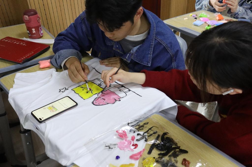 颜料画笔、纯白文化衫、软陶……活动主办方准备了丰富的活动用品,并提前通过官方QQ、第二课堂等渠道进行宣传,活动前就获得了学院学生们的高度关注。活动现场,学生们充分发挥自身创造力,小组分工合作,捏造、绘制出海绵宝宝、哆啦A梦、小黄人等风格各异的卡通人物形象和植物花卉图案。