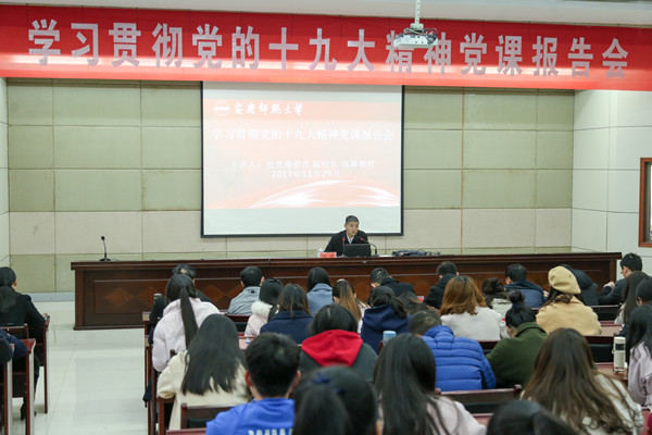 11月29日下午,党委委员、副校长张群在行政楼一楼会议室为bevitor伟德国际1946干部师生作了题为《认真学习习近平新时代中国特色社会主义思想 推进人才培养质量创新发展》的专题党课报告。bevitor伟德国际1946党政主要负责同志、总支委员、全体教职工、学生党员、入党积极分子和学生代表等近200人聆听了报告会。bevitor伟德国际1946党总支负责人主持报告会。