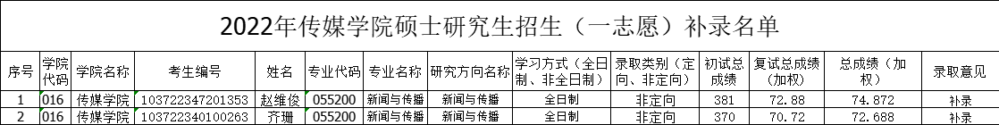 根据学校研究生招生工作领导小组决定,我院新闻与传播专业调控增加2名招生指标,根据《伟德国际1946bv2022年硕士研究生招生复试录取办法》《bevitor伟德国际1946学院2022年硕士研究生招生复试录取工作实施细则》等文件要求,现决定按成绩递补拟录取2名考生,现公示如下,公示时间从2022年4月20日开始,公示为期10天。如有问题,请及时向学校研究生复试录取督查组反映,电话:0556-5300053,邮箱:jiwei@aqnu.edu.cn。