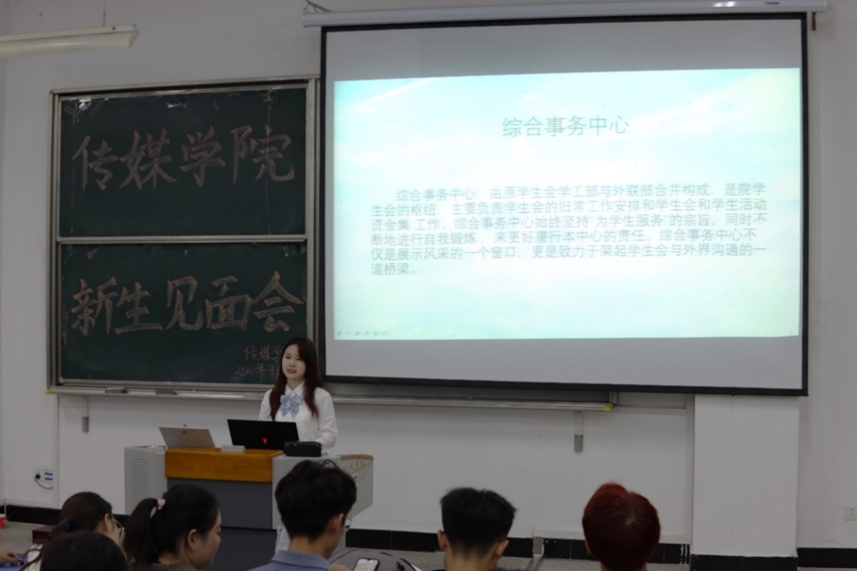 会议介绍了学生会领导下的综合事务中心、权益维护中心、青年文艺中心、青年体育中心、新媒体中心等五个基本工作中心,并由各中心代表以PPT加现场讲解的形式向新同学们介绍了本中心的主要工作及招新要求等。