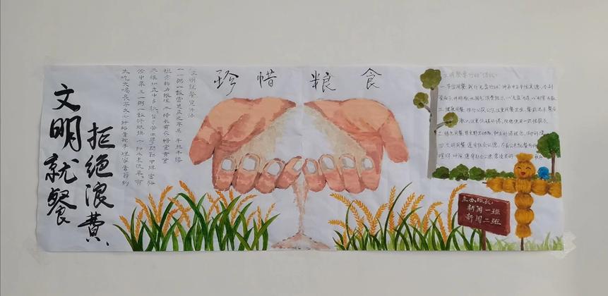 排版、绘画、摘抄字句……黑板报围绕主题以多样的形式展开,新闻学专业2020级的黑板报上绘画了一双粗糙的双手和被捧起的大米,并用金黄色的稻穗和笑脸盈盈的稻草人填充,新闻学专业2020(1)班的解说员朱蕊蕊解释道:“我们在版面设计上将重点放在农民伯伯的手与大米上,用黄与白的碰撞给同学们带来视觉冲击,同时也警示着大家切勿忘记粮食的来之不易。”图文的巧妙结合,表达的生动形象,让“珍惜粮食”的主题更加深入人心。