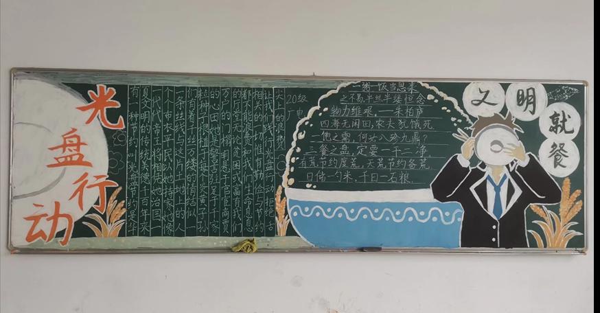 “水稻辛苦种植出来煮熟后变成米饭,黑板报中的绿色象征节约,金黄色代表希望”,广播电视学专业2020级的黑板报用绿色作为底色与周围点缀着的金黄色稻穗相互映衬,右边描绘着一个捧着盘子吃饭的男生。