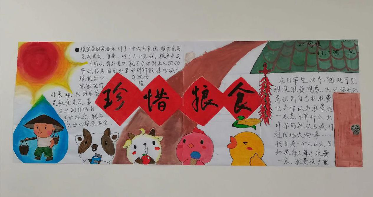 网络与新媒体专业2020级的黑板报以“珍惜粮食”口号为主题,描绘了卡通形象的“鸡鸭牛羊”、扛着锄头的农民伯伯等形象。“家畜和家禽呼应农民伯伯的生活环境,太阳下的水滴是辛勤劳作的汗水,说明种植粮食的艰辛,以此呼吁大家珍惜食物。” 网络与新媒体专业2020(1)班张子成说。