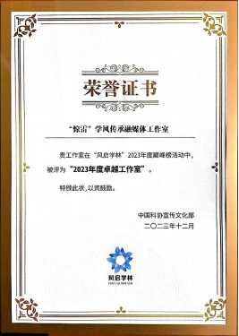 近日,中国科协公布了“风启学林”社区2023年度卓越工作室名单,经中国科协评审,最终确定全国共100个工作室为2023年度卓越工作室。我院教师孙鹏飞团队的“惊雷”学风传承融媒体工作室从全国651家工作室中杀出重围成功入选年度卓越工作室。